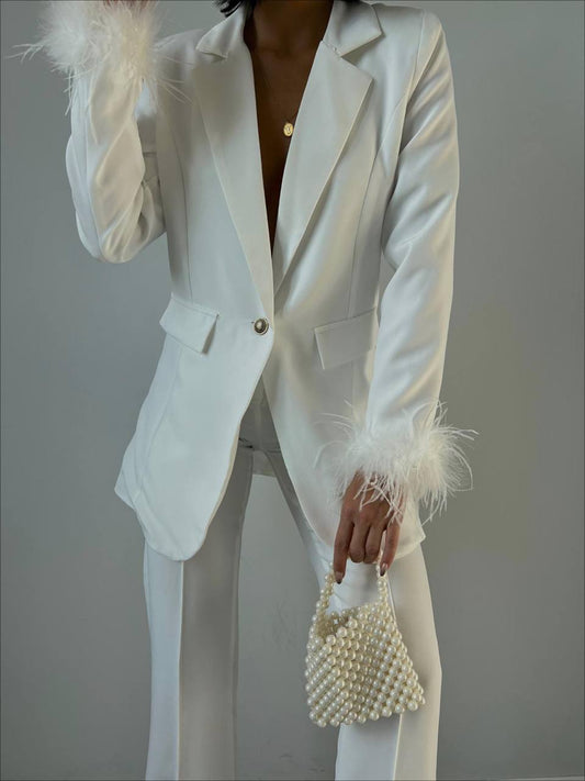 Спортно-Елегантен Костюм с Ествени Пера Бял