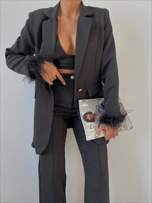 Спортно-Елегантен Костюм с Ествени Пера Черен